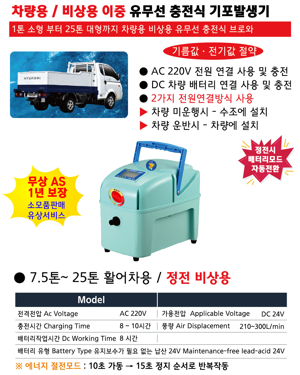 YA-AD7525 – 차량용 / 비상용 이중 유무선 충전식 DC 기포발생기
